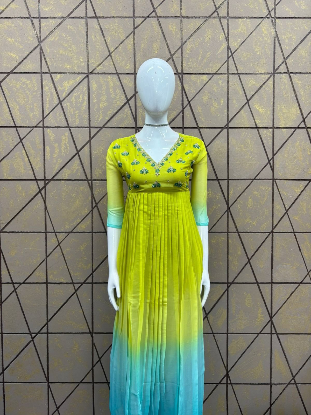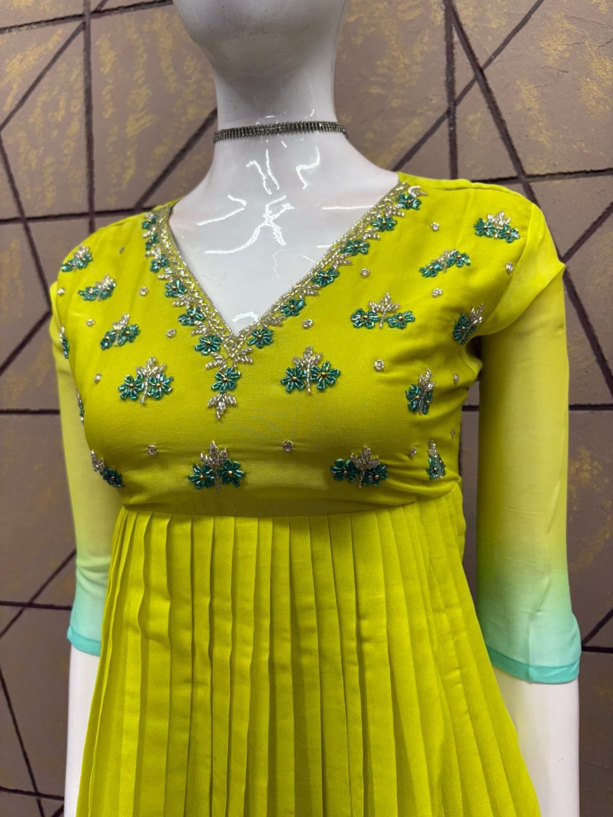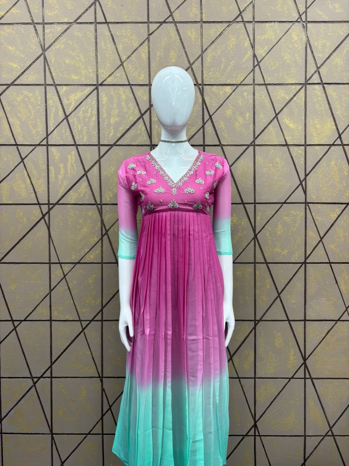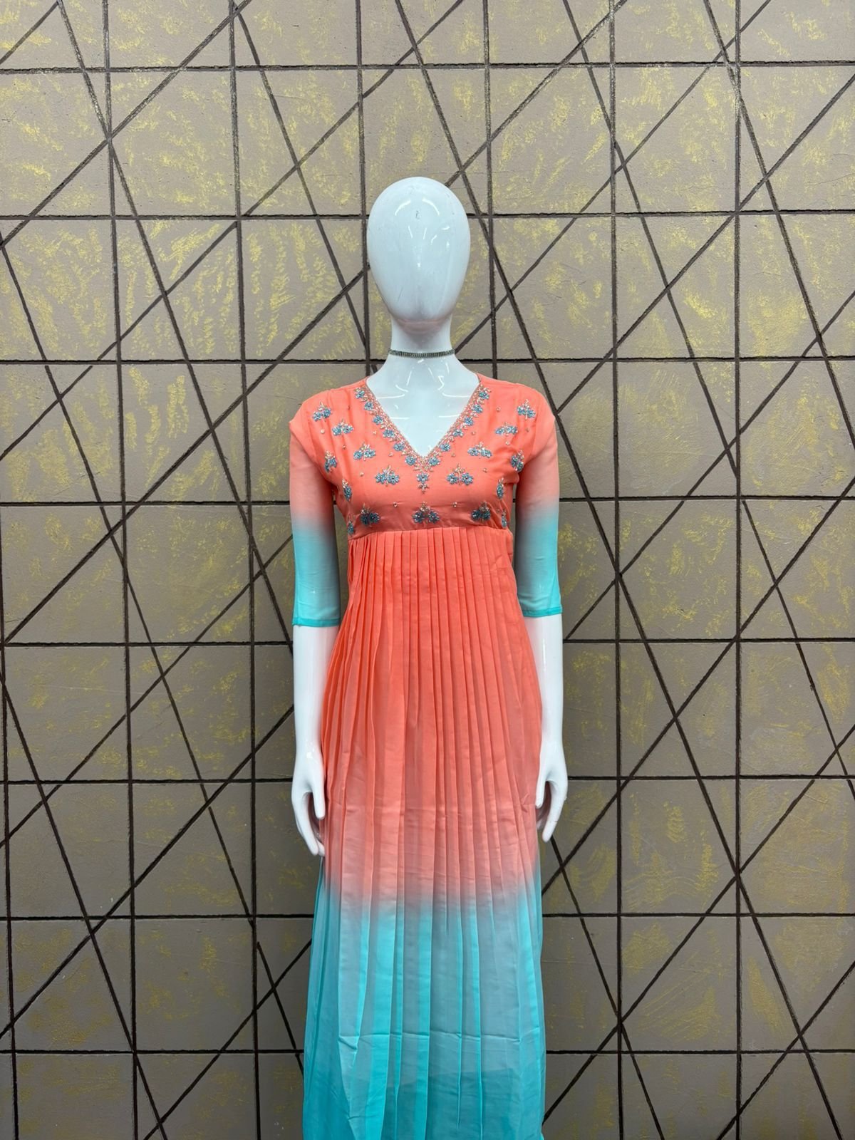 PATTERN :PLEATED UMBERLLA KURTI , FABRIC: STAR GEORGEET, HEIGHT:42, LINNING : CREPE, SLEEVE – 3/4TH , MODEL :HEAVY WORK ON NECK AND YOKE PART